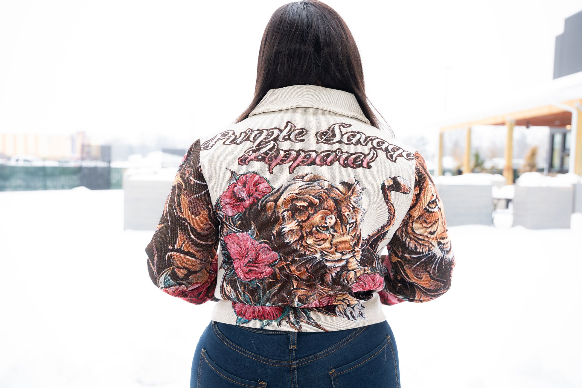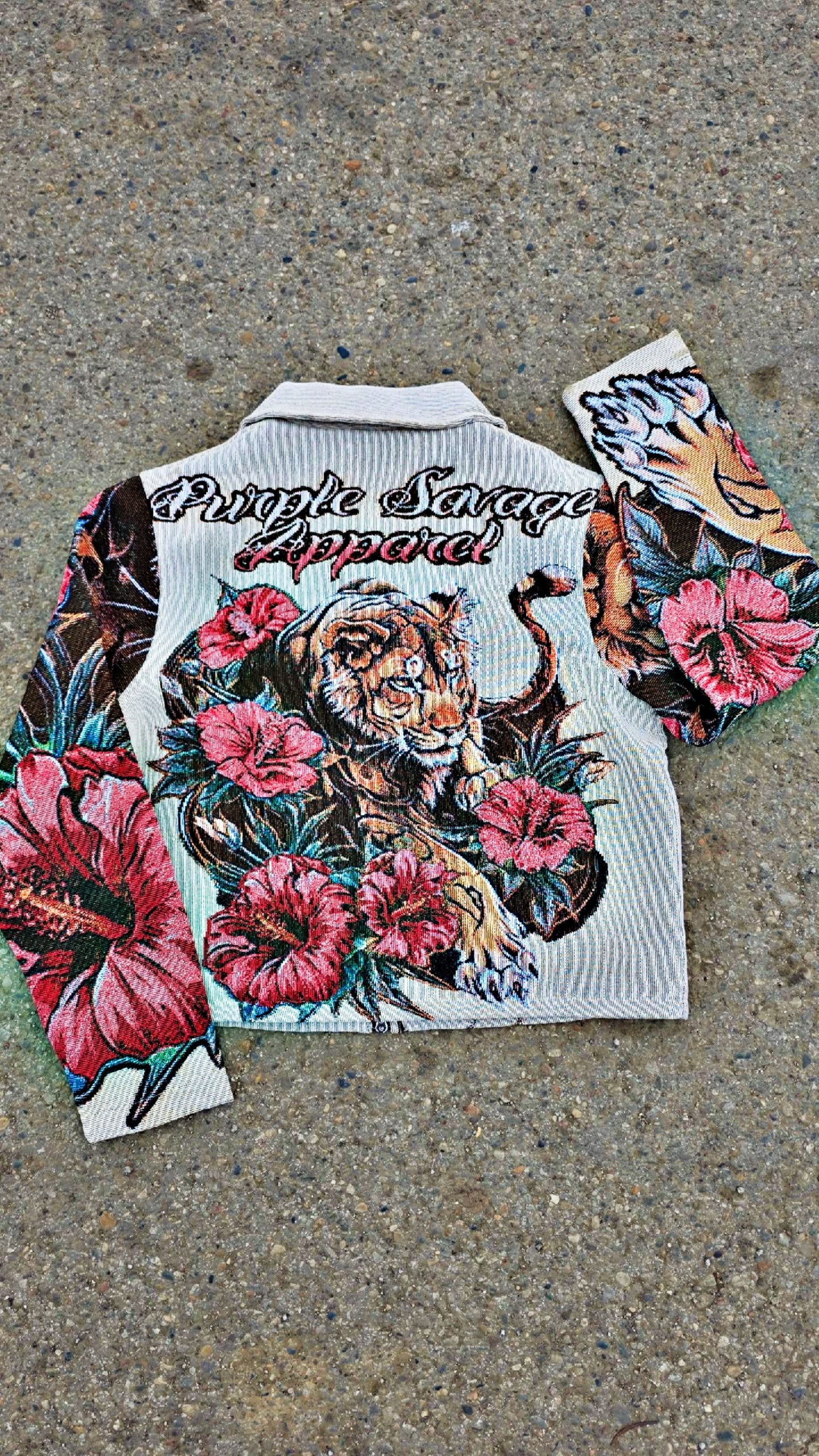 The Be My Valentine Women's Tapestry Jacket features an intricate lion Hibiscus Field logo complemented by a striking arrangement of pink and burgundy Hibiscus flowers. This design not only enhances visual appeal but also embodies a vibrant aesthetic, making it a suitable choice for both casual and formal settings.
